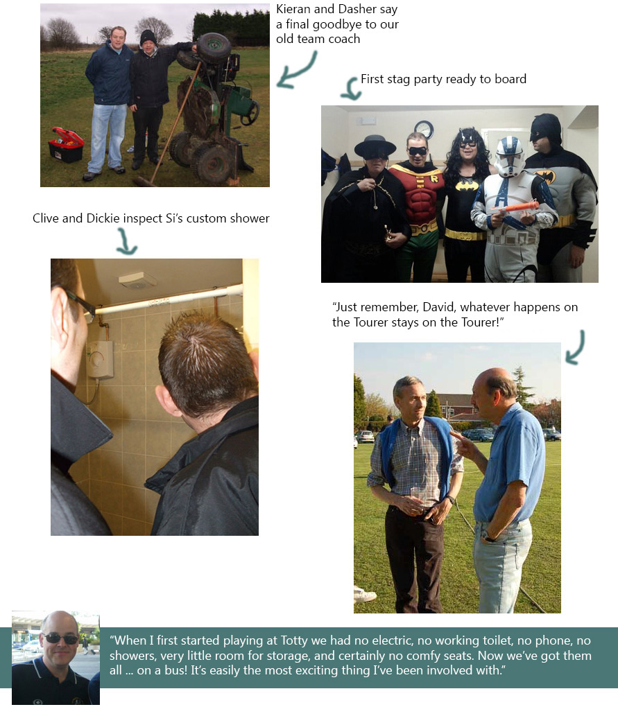 While the exterior looks are superb, where the Totty Tourer really scores is in its fully customised interior. Recognising that players need to arrive at games both refreshed and in comfort, we have installed three gaming machines, a 72” LCD TV panel and a fridge capable of storing over 2,000 cans and bottles. There’s even a separate shower and toilet for Simon Marsh.