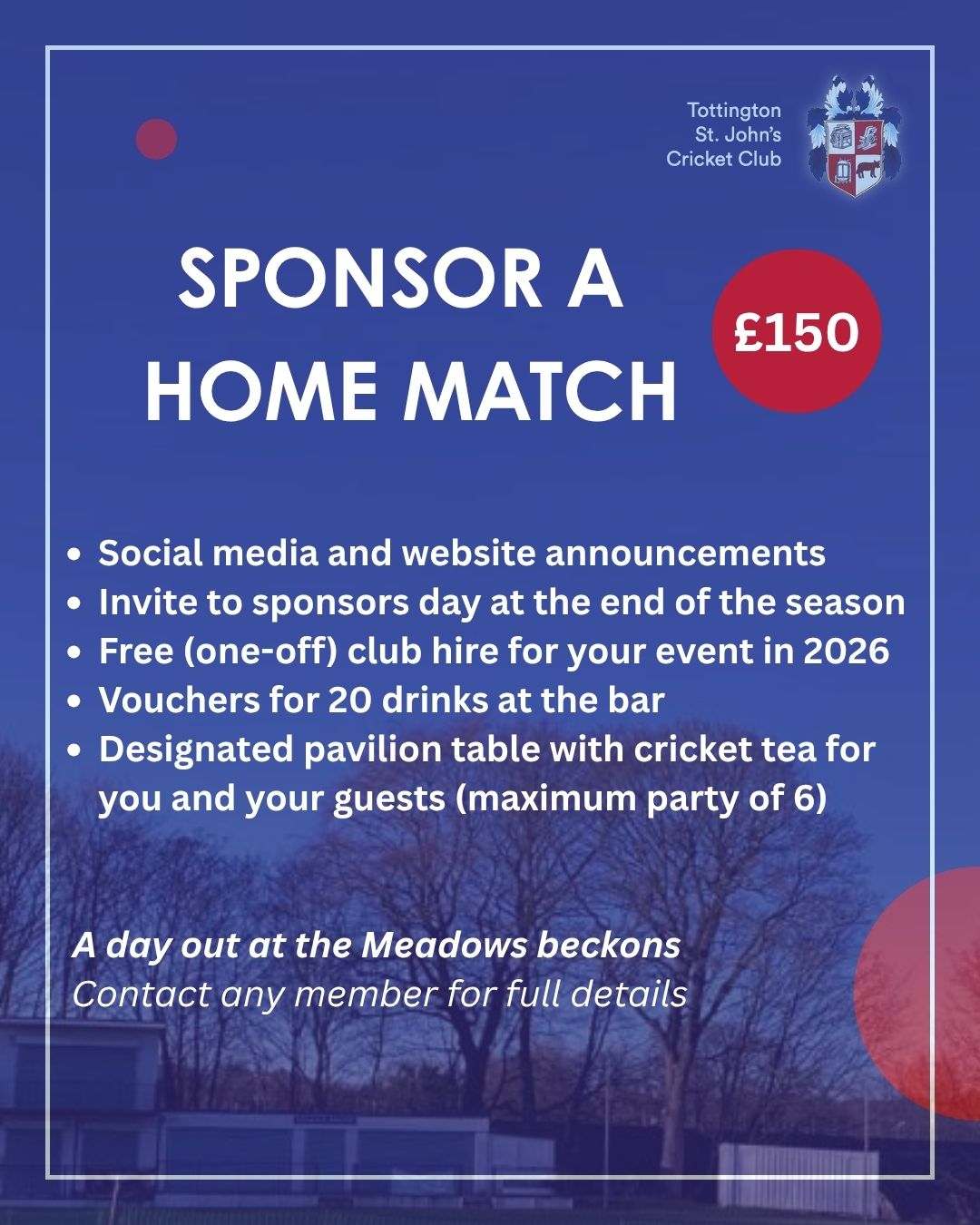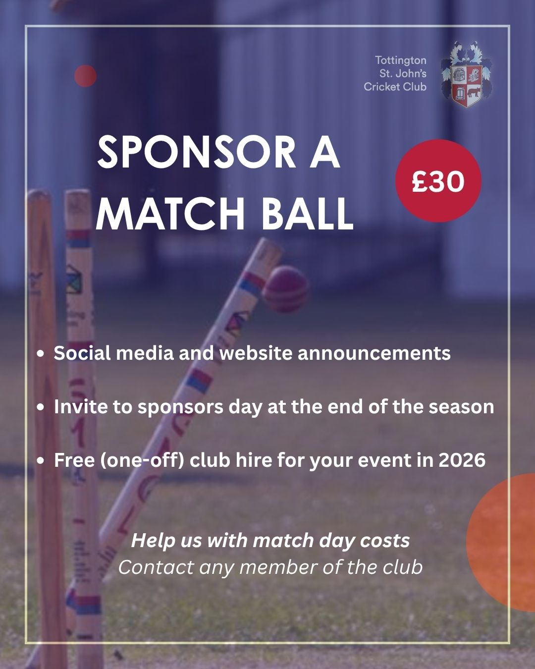 Tottington St Johns CC has a number of sponsorship opportunities available, ranging from match ball and player sponsorship to ground advertising, website adverts and contributions towards new equipment. A range of new sponsorship packages is available from 2026.